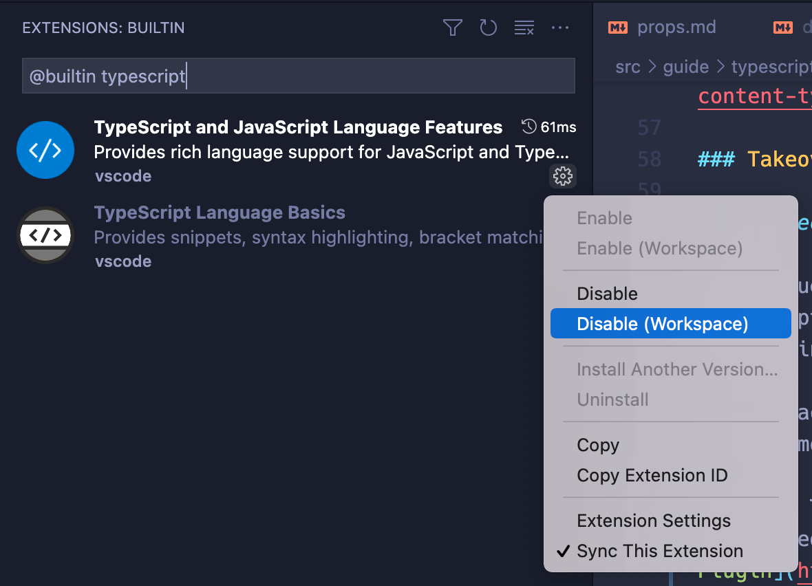 4. Натисніть маленьку піктограму шестірні «TypeScript and JavaScript Language Features» і виберіть «Disable (Workspace)».